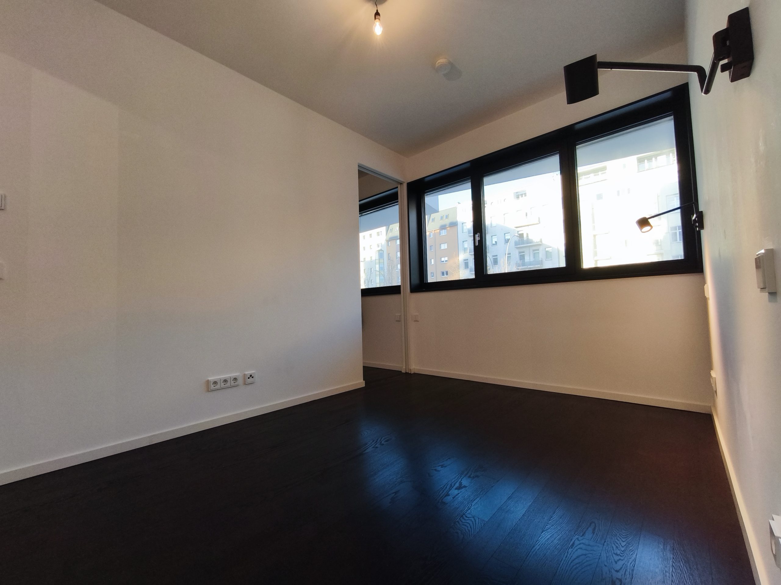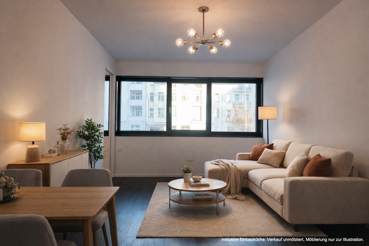 公寓位于一层,但属于抬高式一层(Hochparterre),这一点在照片中可以清晰看到。得益于这一高度设计,即便拥有大面积落地窗,也能提供良好的视线遮挡,有效保障居住私密性。